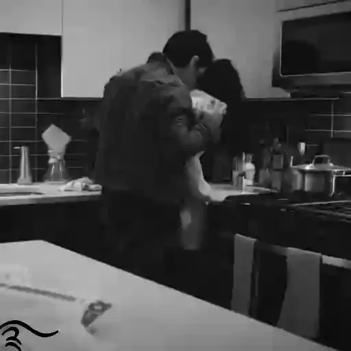 Casal se beijando na cozinha, em preto e branco. O homem está de pé e a mulher está com a mão na pia.