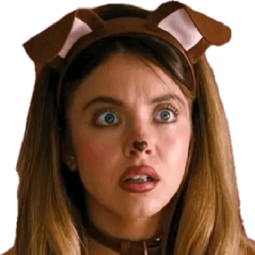 Uma mulher com expressão surpresa e confusa, usando uma fantasia de cachorro com orelhas marrons e brancas.