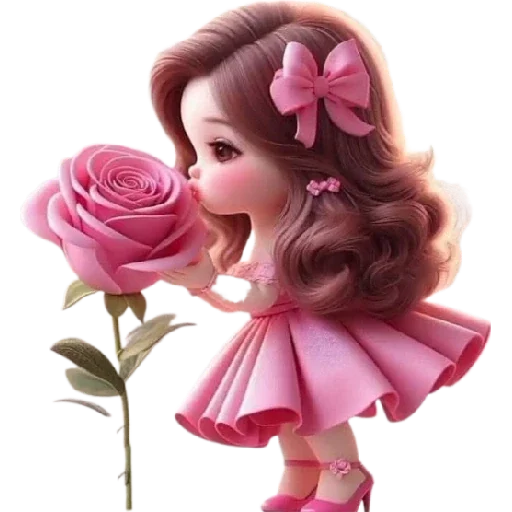 Menina de cabelo castanho com dois laços cor-de-rosa cheirando uma rosa cor-de-rosa gigante.