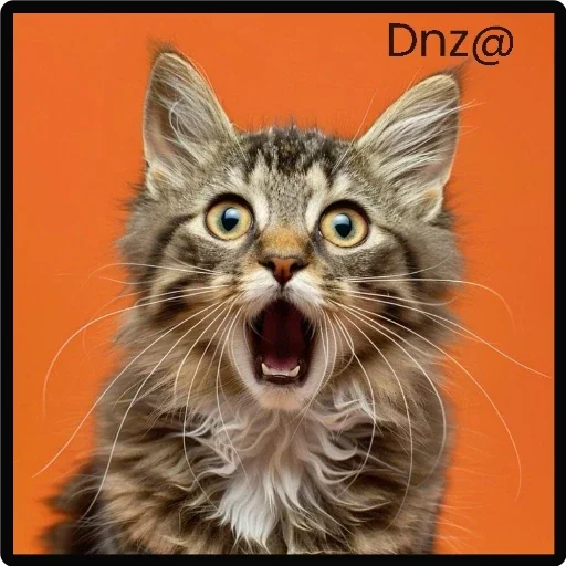 Gato com olhos arregalados e boca aberta, parecendo surpreso ou assustado. Fundo laranja.