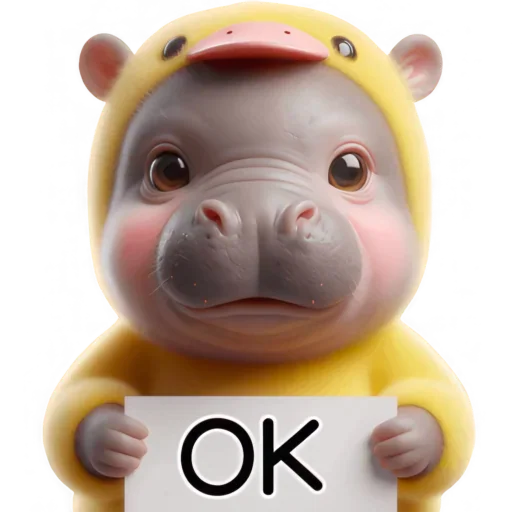 Um hipopótamo cinza com olhos castanhos e bochechas rosadas, vestindo um pijama amarelo com capuz de leão, segura um papel com a palavra 'OK'.