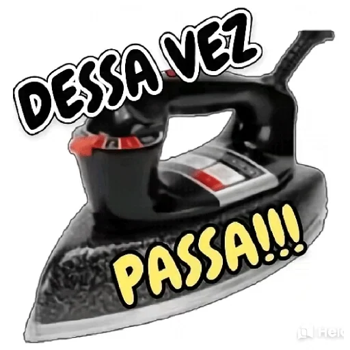 Um ferro de passar roupa preto com o texto 'DESSA VEZ PASSA!!!' sobreposto. O ferro tem detalhes em vermelho e prata.