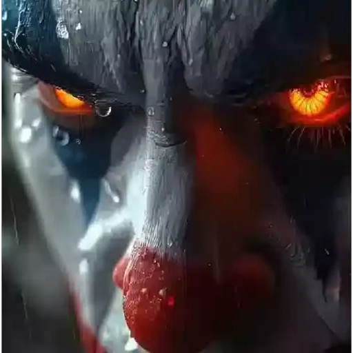 Rosto de um homem com olhos laranjas brilhantes e nariz sangrando, com lágrimas ou suor na pele.