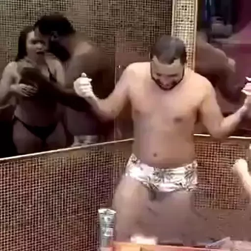 Um homem sem camisa e de sunga dançando em frente a um espelho, com duas mulheres ao fundo.