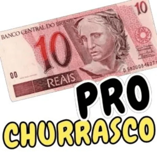 Uma nota de 10 reais do Banco Central do Brasil com a imagem de uma mulher e o texto 'PRO CHURRASCO' em letras grandes amarelas e pretas.