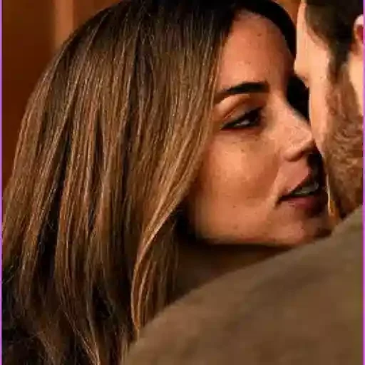 Mulher com cabelos castanhos e olhos fechados beijando um homem.