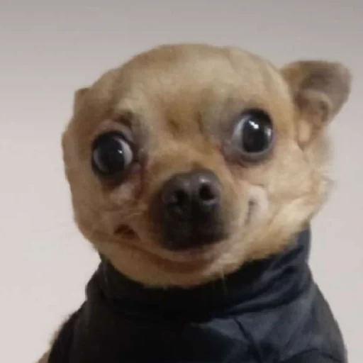Um cachorro Chihuahua com olhos arregalados e expressão surpresa, vestindo um casaco preto.