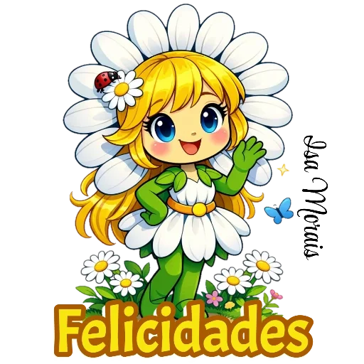 Uma menina de cabelos loiros vestida de flor, com uma joaninha no cabelo e um sorriso. Ela está cercada por flores e a palavra 'Felicidades' está escrita abaixo dela.