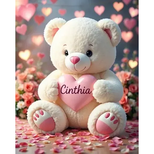 Um ursinho de pelúcia branco com um coração rosa que tem o nome 'Cinthia' escrito, rodeado de flores e corações.
