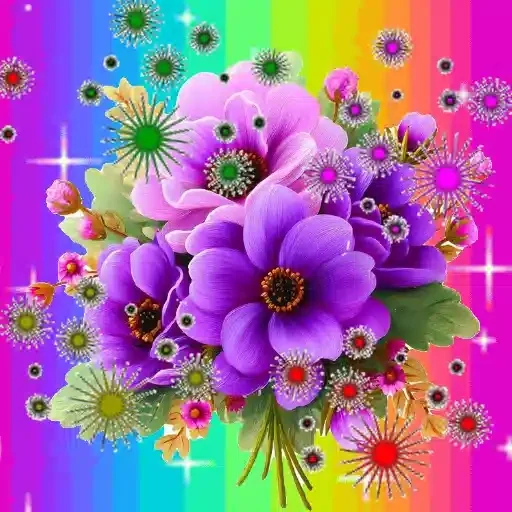 Um buquê de flores roxas e lilás com detalhes coloridos sobre um fundo arco-íris. O buquê inclui flores grandes e pequenas com centros pretos e detalhes brilhantes.