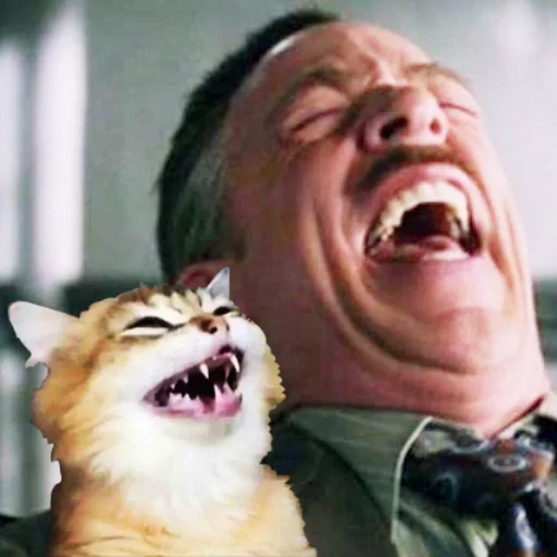 Um homem e um gato laranja com expressão de raiva ou dor, bocas abertas mostrando os dentes.