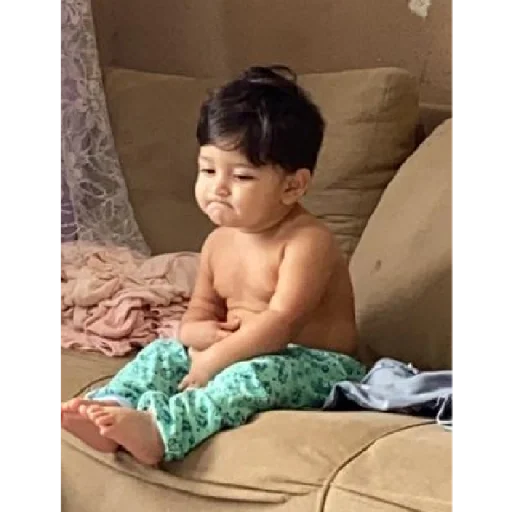 Menino pequeno sentado no sofá, nu, com calça verde decorada, olhando para o lado com expressão séria.