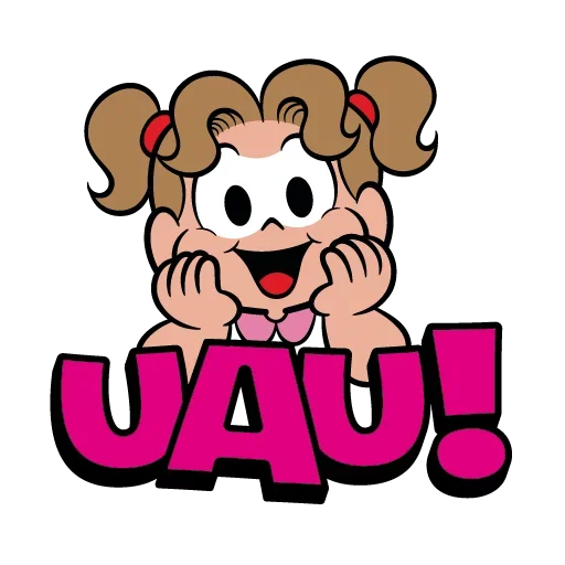 Menina de olhos grandes e cabelos castanhos em coque, com expressão de surpresa e boca aberta, usando um laço rosa. Abaixo dela, está escrito 'UAU!' em letras grandes e rosa.