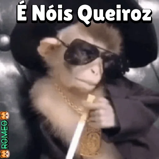 Um macaco vestido com um chapéu e óculos de sol, segurando um cigarro, com o texto 'É Nóis Queiroz' em cima.