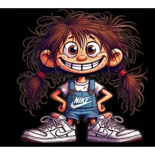 Menina de desenho animado com grandes olhos castanhos e um sorriso largo, usando um macacão azul com a logo da Nike, tênis brancos e com tranças castanhas.