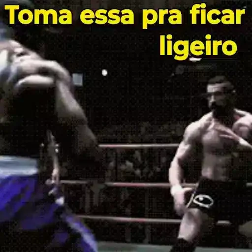 Dois homens musculosos em uma luta, um com shorts pretos e o outro com shorts azuis, com o texto 'Toma essa pra ficar ligeiro' em amarelo.