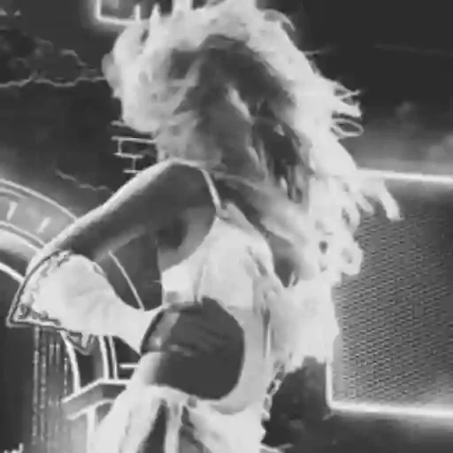 Uma mulher loira dançando em frente a uma luz estroboscópica, com cabelo voando e braços estendidos.