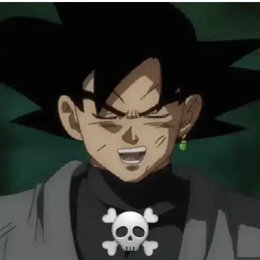 Personagem de anime com expressão facial intensa e um crânio com ossos cruzados na camisa.