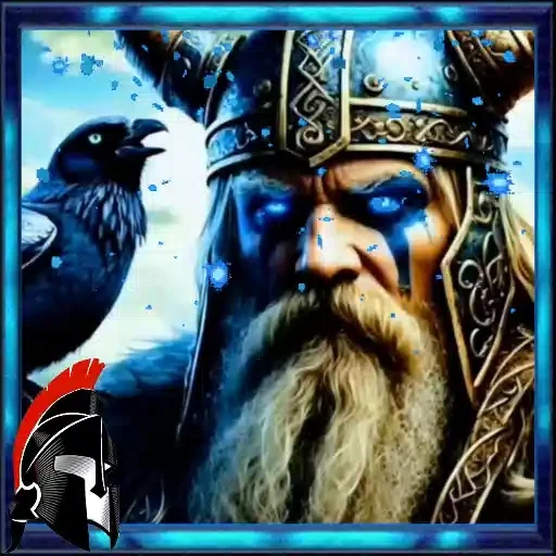 Um guerreiro viking com um elmo decorado e olhos azuis brilhantes, acompanhado de um corvo preto. Ele tem uma barba longa e grisalha.