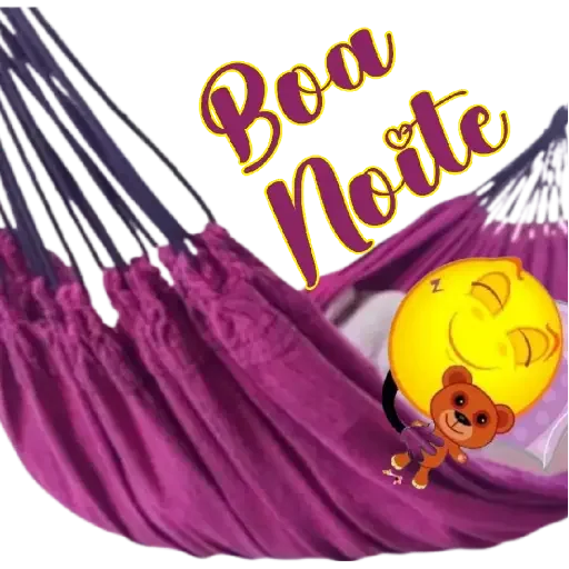 Um urso de pelúcia em uma rede roxa com um grande sol amarelo e a frase 'Boa Noite'.