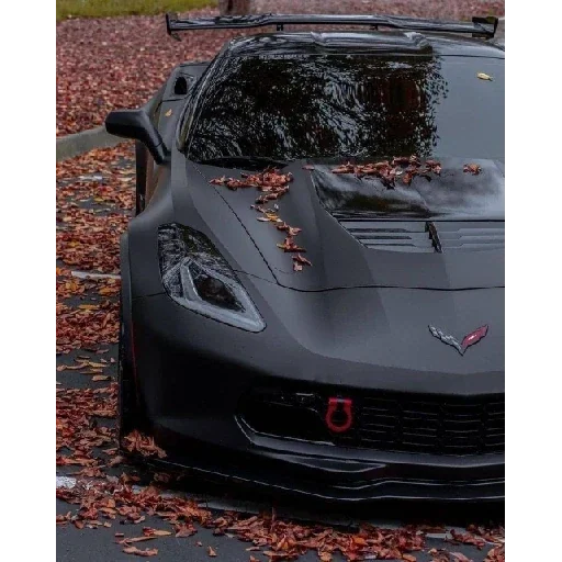 Um carro esportivo preto coberto de folhas secas vermelhas e laranjas em um asfalto.