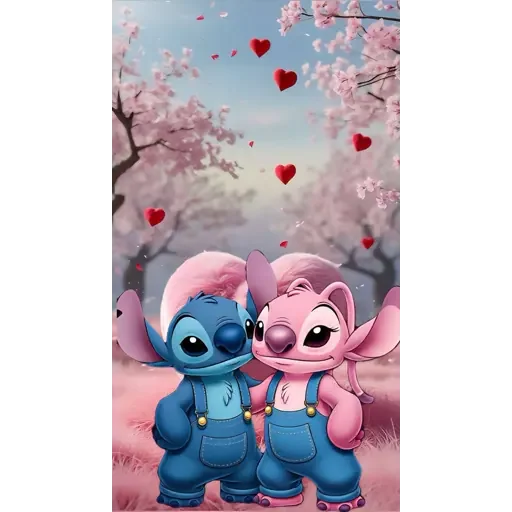 Stitch e Angel, personagens de Lilo & Stitch, em um cenário romântico com flores rosadas e corações vermelhos.