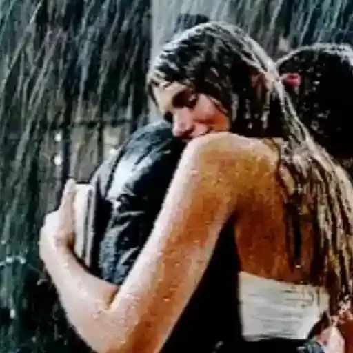Casal se abraçando sob a chuva, a mulher com o cabelo solto e um vestido branco por baixo, o homem com uma camisa escura. Ela está com o rosto abaixado.