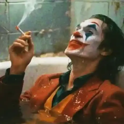 O Coringa, caracterizado por Joaquin Phoenix, fumando um cigarro em um banho, com maquiagem branca no rosto e um casaco vermelho. Ele está com a boca aberta e parece estar rindo.