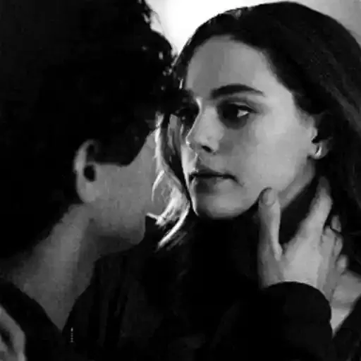 Um homem beijando o rosto de uma mulher, com a mão dela no rosto. A imagem é preto e branco.