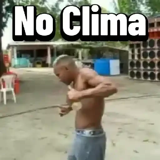 Homem sem camisa dançando com as mãos no peito, ao ar livre, com o texto 'No Clima' em destaque. Ele parece estar se movendo ao som de música.