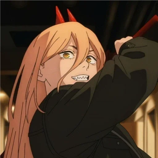 Uma garota com cabelos laranjas e chifres vermelhos, vestindo preto, com expressão de raiva ou surpresa.