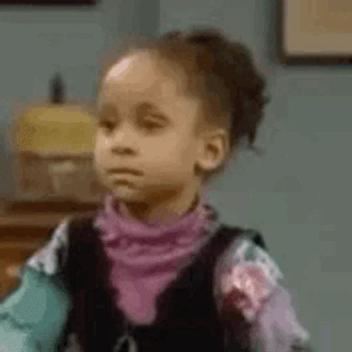 Menina pequena com expressão séria, cabelo castanho preso, vestindo um suéter preto sobre uma blusa rosa e azul.
