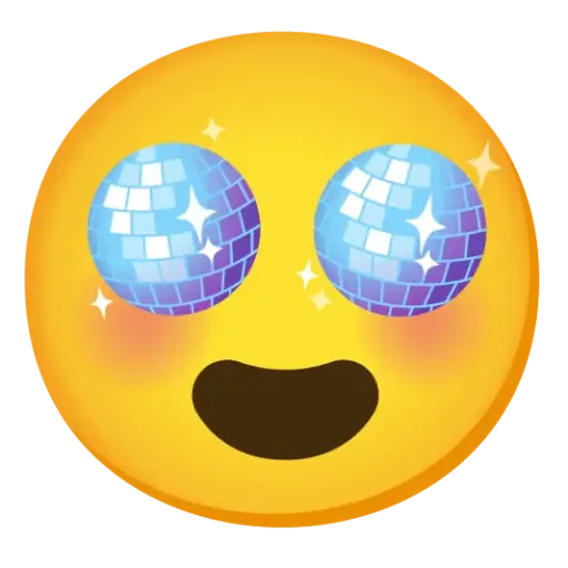 Rosto amarelo com olhos de bola de discoteca e boca aberta, com bochechas rosadas e faíscas.