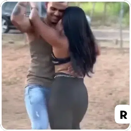 Um casal dançando ao ar livre, o homem com uma camiseta marrom e jeans, e a mulher com um vestido cinza, ambos se abraçando e se movendo.