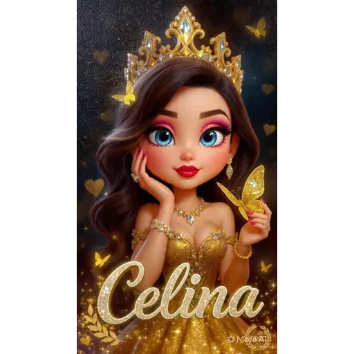 Uma mulher loira com coroa dourada e vestido dourado, segurando um espelho. Ela tem maquiagem colorida e unhas pintadas. O nome 'Celina' está escrito em letras douradas abaixo dela.