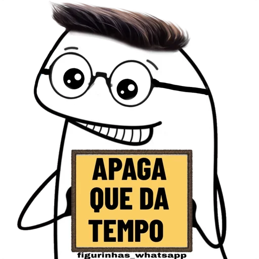 Um desenho de um personagem com óculos e um penteado para cima, segurando um cartaz amarelo com o texto 'APAGA QUE DA TEMPO'.