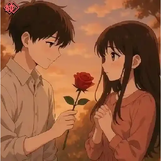 Um casal de anime, o homem com cabelos pretos e camisa bege olha para a mulher com cabelos pretos e blusa vermelha que segura as mãos juntas. Ele oferece uma rosa vermelha.