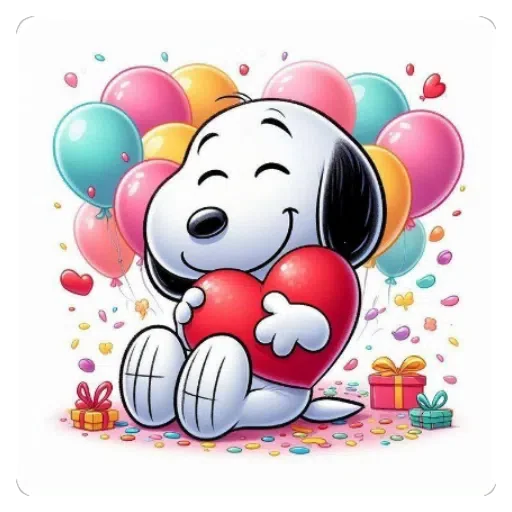 Snoopy abraçando um coração vermelho gigante, com balões coloridos ao fundo e presentes ao redor.