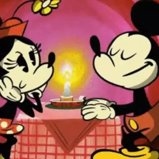 Mickey e Minnie Mouse sorrindo um para o outro, com Minnie usando um vestido vermelho com manchas brancas e um chapéu…