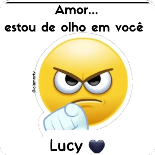 Um emoji amarelo com expressão de desconfiança e dedo indicador levantado, com texto 'Amor... estou de olho em você' e nome 'Lucy' com um coração preto.