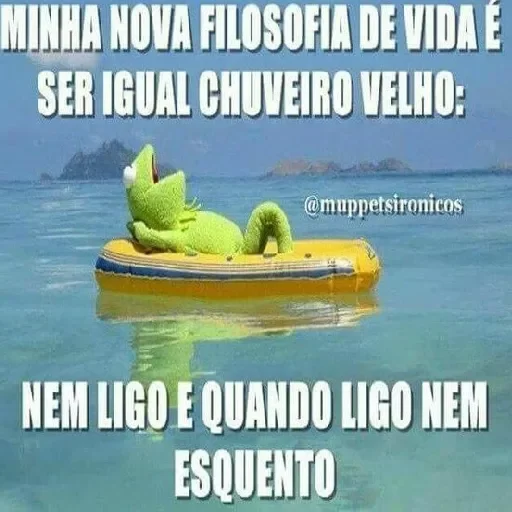 Um dragão verde relaxado em uma boia amarela em águas calmas, com texto em branco: 'MINHA NOVA FILOSOFIA DE VIDA É SER IGUAL CHUVEIRO VELHO: NEM LIGO E QUANDO LIGO NEM ESQUENTO'.