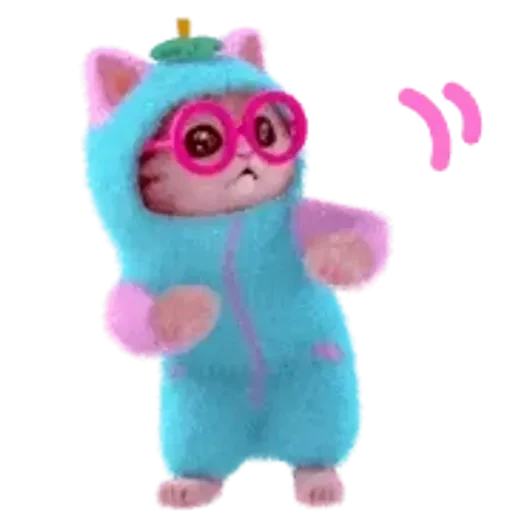 Gatinho rosa vestindo um macacão azul com óculos rosa e uma expressão surpresa, com uma pequena decoração verde na cabeça.