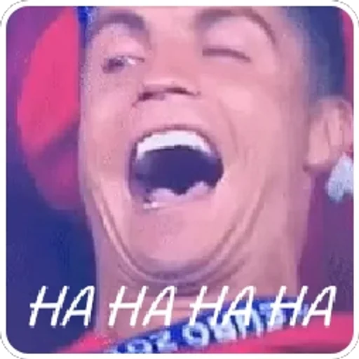 Um homem ri alto com a boca aberta e os olhos fechados. Ele tem um fundo vermelho e azul. 'HA HA HA HA' está escrito em branco na parte inferior.