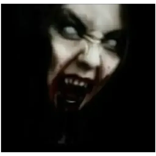 Rosto de vampiro com olhos claros e presas, mostrando um olhar assustador com sangue na boca.