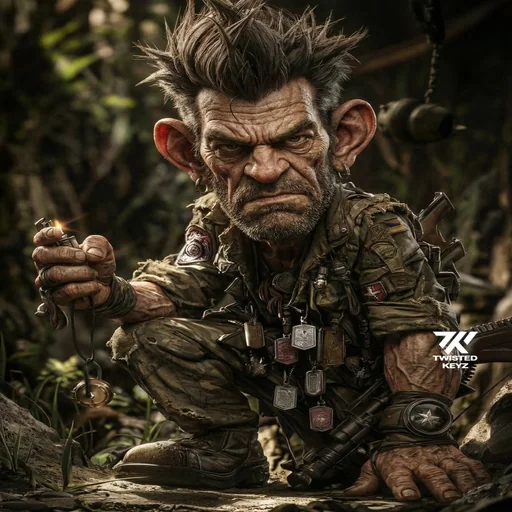 Um homem com aparência de troll, de cabelos castanhos e eriçados, com expressão séria e olhos franzidos, vestindo roupas sujas e esfarrapadas, em um ambiente escuro e com vegetação ao fundo.