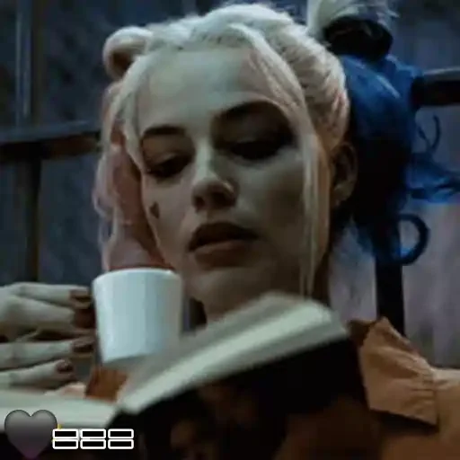 Harley Quinn com uma xícara de café, parecendo sonolenta ou entediada, com olhos semicerrados e uma expressão relaxada.