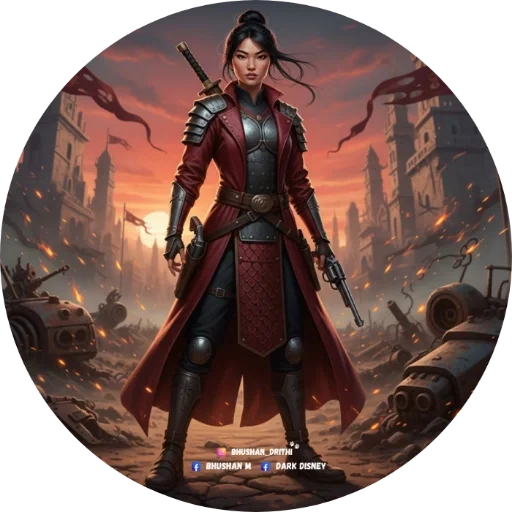 Uma mulher com cabelos pretos e um traje de armadura preta e vermelha, com espadas nas costas e na mão, em um cenário de destruição e incêndios ao pôr do sol.