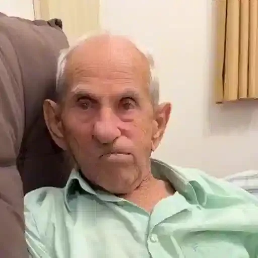 Um homem idoso com expressão séria, usando uma camisa verde claro, sentado em um sofá.