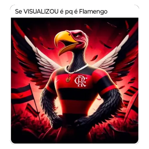 Um pássaro com bico amarelo e penas brancas nas costas, vestindo uma camisa rubro-negra com um logo branco, contra um fundo vermelho e preto. A legenda 'Se VISUALIZOU é pq é Flamengo' aparece acima.