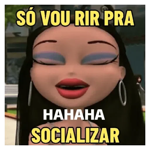Uma mulher de anime com olhos fechados e expressão de riso, com texto 'SÓ VOU RIR PRA HAHAHA SOCIALIZAR' em letras amarelas e brancas.